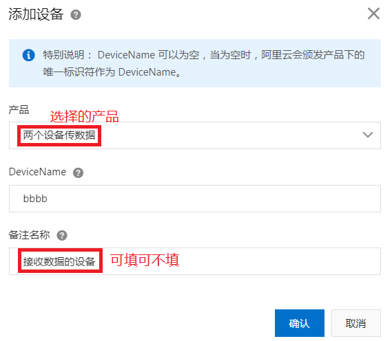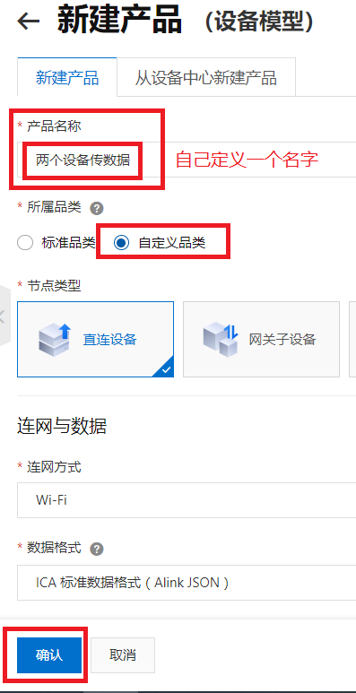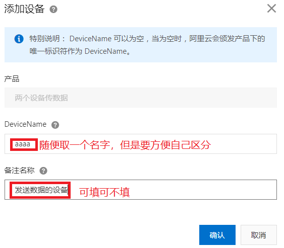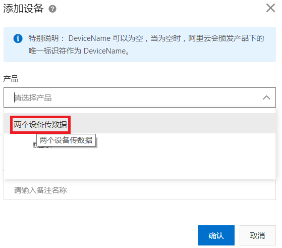 这里因为以为了测试数据传输(云产品流转),所以取名为“两个设备传数据”。