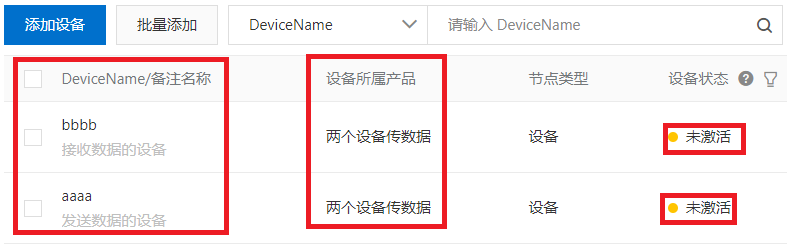 现在,在——“两个设备传数据”——这个产品下,有两个设备:aaaa和bbbb。