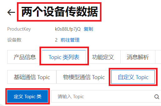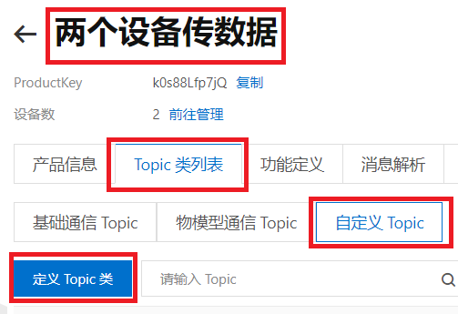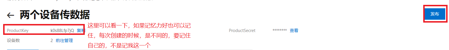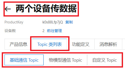 注意看他们所属产品和设备名称(DeviceName)。这两个设备都属于: “两个设备传数据”这个产品。