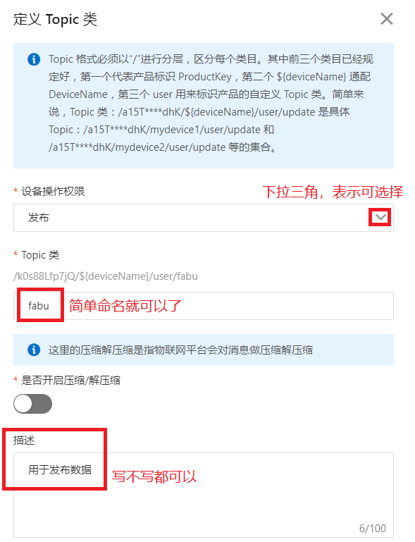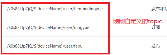 给产品——“两个设备传数据”——添加三个topic:订阅、发布、订阅和发布。