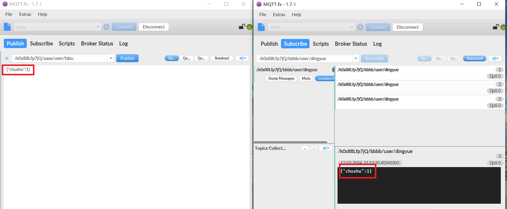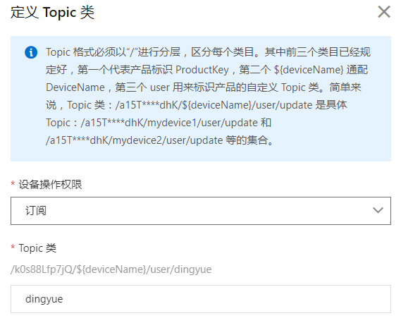 修改的方式为——"/产品/设备/user/topic"——这里因为是接收,所以用订阅。
