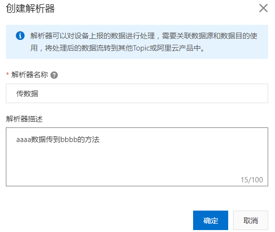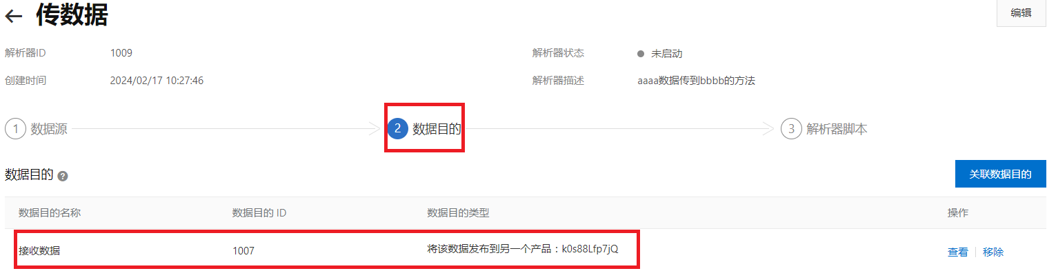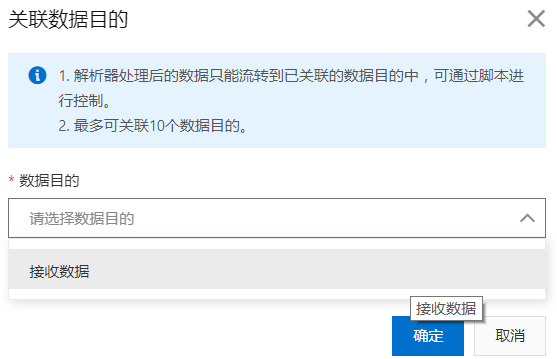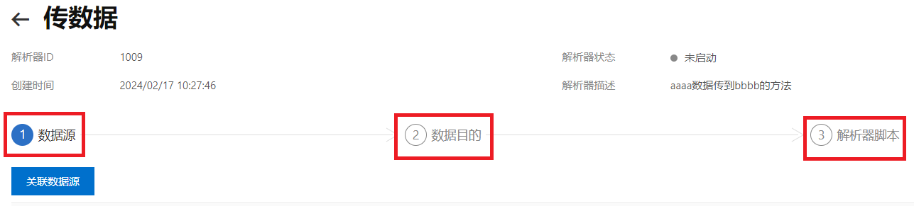 注意观察,云产品流转显示有三个步骤:解析器——数据源——数据目的,这不是填写顺序,填写的顺序是:数据源——数据目的——解析器,一步一步填写。